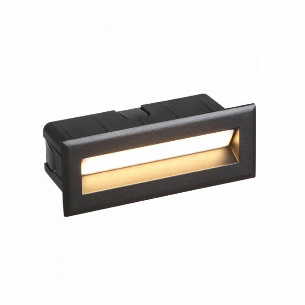 Oldalfalba süllyeszthető, fekete színű, alumíniumból készült kültéri lámpa. 3000 Kelvines, azaz meleg fehér fényű beépítet LED fényforrással rendelkezik, mely nem cserélhető. IP65-ös védettségű. Kivágási mérete 127x44mm, besüllyesztési mélysége 60mm. Specifikációk:Gyártó: Nowodvorski Cikkszám:: TL-8165 Foglalat: 1 x Beépített LED Méret (ma x sz x mé): 55 x 1