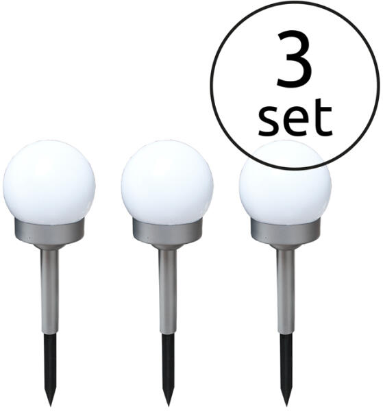 Solar műanyag fehér gömb, ezüst műanyag leszúróval, IP44, akkumulátorral: AAA 100mAh 1,2 V, Ø100, M:350, tartozék:1xLED 0,06W 3V, 3db/szett