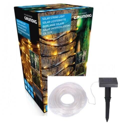 Grundig Napelemes lámpa fényfüzér csőben 10m melegfehér Prémum napelemes fényfüzér, fénycső 100 melegfehér világító LED, amellyel könnyedén és szabályosan alakíthatunk ki kerti dekorációs világítást. Grundig napelemes lámpa fénycső 10m melegfehér A napelemes fényfüzér kiválóan fákhoz, mefence köré, kerti szegélyekhez, balkozokhoz bokrok megvilágtásához is.