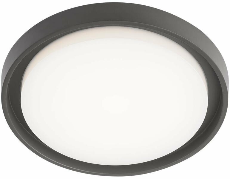 Modern stílusú, kerek kültéri mennyezeti lámpa, sötét szürkére festett alumínium vázzal és fehér polikarbonát búrával. A lámpa beépített LED fényforrással és IP54-es védelemmel rendelkezik.