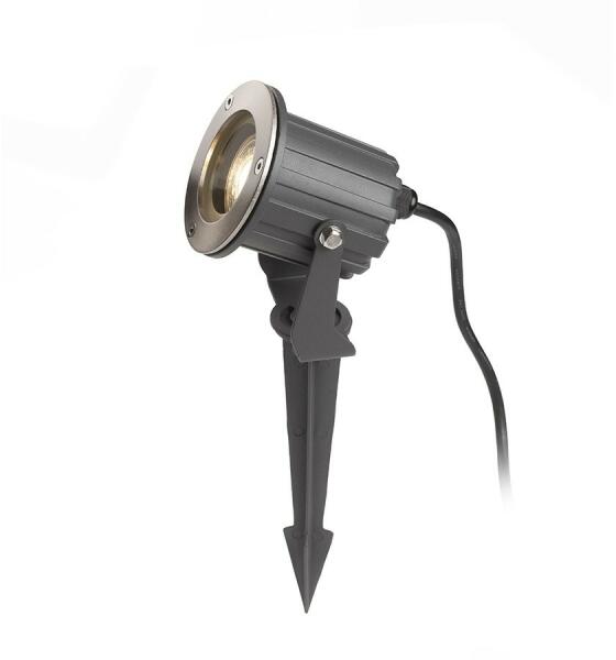 Kültéri alumínium reflektor tüskével GU10-es foglalatú LED izzóhoz, rozsdamentes acél elülső kerettel. Egy méteres csupaszított kábelvéggel.