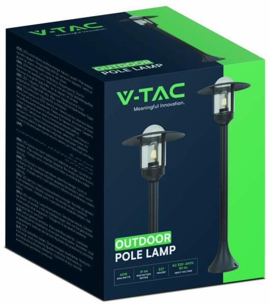 V-TAC Kültéri állólámpa, matt fekete színű, 97,5 cm magas (E27) Fekete színűre festett, alumínium vázas, 97,5 cm magas állólámpa, melybe 1 db E27-es foglalatú fényforrás helyezhető. Előnye ezáltal, hogy ha meghibásodik a fényforrás, egyszerűen tudjuk cserélni azt. Kiváló választás lehet fixen telepített kerti világításra, hiszen az E27-es fényforrást magunk vála