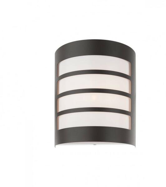 Sötét szürke színű kültéri fali lámpa, festett rozsdamentes acél lámpatesttel és opálos polikarbonát betétes búrával, IP44-es védelemmel.