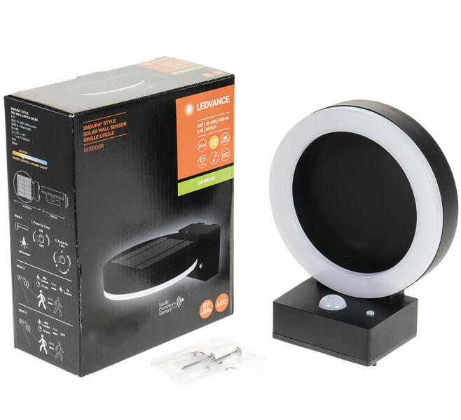 LEDVANCE ENDURA® STYLE SOLAR SINGLE CIRCLE kültéri fali lámpa fekete színben, 400 lm fényerő, 6 W, 50000 h, IP44 védelemmel, 3,2 V DC, 3000 K, 4058075392762
