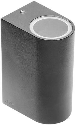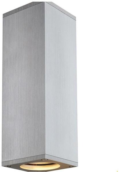 THEO UP-DOWN ezüst GU10 alumínium fali lámpa angol nyelvű gyátrói leírása: The THEO wall-mounted luminaire is made from aluminium. Thanks to the position of the two incorporated sockets, the installed high-voltage halogen lamp with GU10 socket produces two equal but oppositely arranged light beams (UP/DOWN). The electrical connection of the luminaire, which comes in three colours, is direc