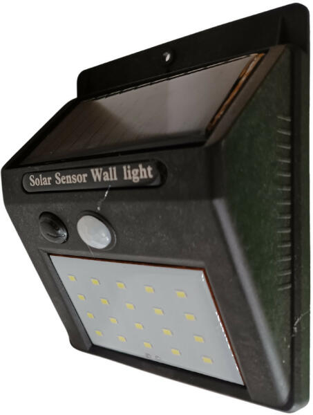 Napelemes led lámpa alkonykapcsolóval és mozgásérzékelővel. 20 db led fénnyel, 10Lux. Mérete: 102 x 53 x 130 mm.