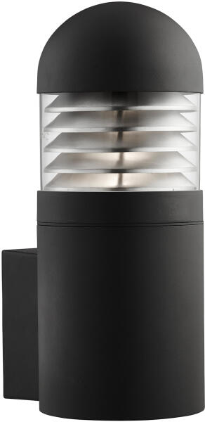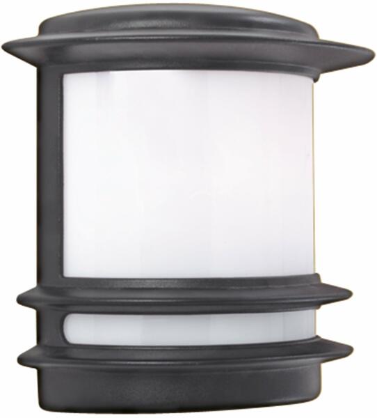 Hagyományos kerti fali lámpa, matt fekete öntött alumínium bázissal, fehér, ütésálló polikarbonát/opálüveg fényszóróval. IP44-es besorolású. Akár energiatakarékos (1 x 11W) izzókkal is használhatod.