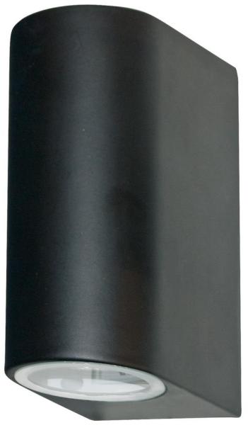 Egyszerű de nagyszerű, modern kültéri fali lámpa, lefelé és felfelé irányuló két fényforrással, fekete burkolattal. Gu10-es foglalattal, halogén izzókkal.