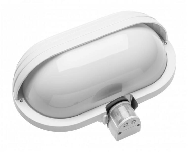 Ovális alakú homlokzati lámpatest, mozgásérzékelővel. Időzítő 3-10 perc között állítható, 1,8-2 m távolságról érzékel. Működési hőmérséklet: -20 - +40°C Teljesítmény: 60W Feszültség: 220-240V Foglalat: E-27 Védettség: IP40 Anyaga: Műanyag Mérete:270x150x110mm