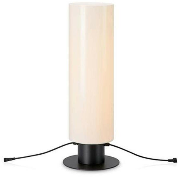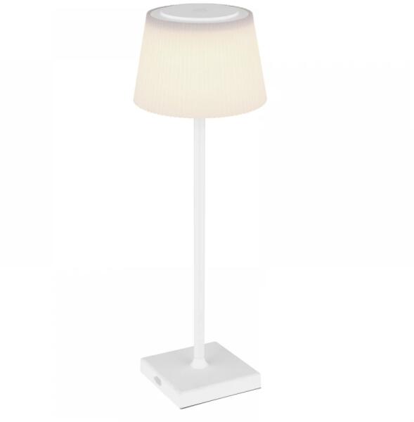 Matt fehér színű fém talpa asztali lámpa bordázott, opálos műanyag búrával, beépített LED fényforrással, IP44-es védelemmel. A lámpa akkumulátorral üzemel, érintéssel állítható a fényereje és a színhőmérséklete(3000,4000, 5000K), USB kimeneten keresztül tölthetó.