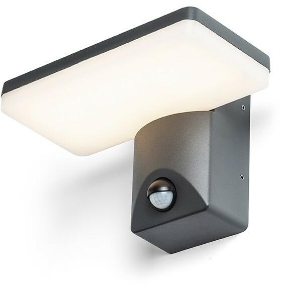 Kültéri LED fali lámpa integrált érzékelővel és az érzékelő beállításának lehetőségeivel. Felszerelés után lefelé irányul a fénye. Öntött alumíniumból készült, opál alsó búrával.