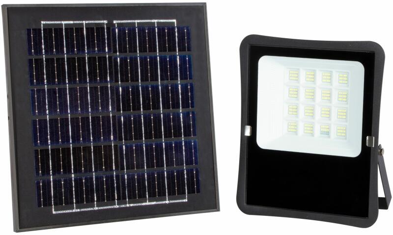 LED reflektor, napelem, újratölthető akkumulátorral, 20W, 1600lm, 6000K A fekete 20W-os LED-es reflektor napelemmel és akkumulátorral, valamint távirányítóval IP65 védettségű. A távirányító segítségével távirányítóval kiválasztható a munkamód és 2 fényerőszint között lehet dönteni. A világítási idő programozható és a világítás erőssége szabályozható. A