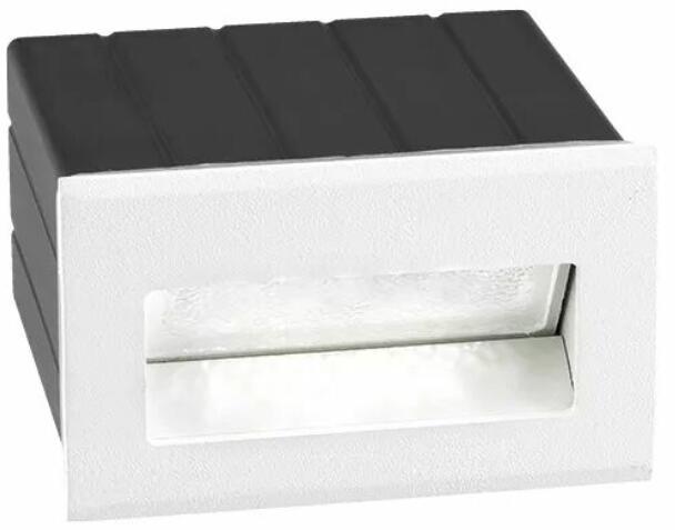 Szögletes, modern, besüllyeszthető kültéri fali lámpa. Lépcsővilágításra alkalmas. Anyaga alumínium, színe fehér. A lámpa fénye 17 fokos szögben világít, meleg fehér fényű, beépített LED fényforrást tartalmaz, mely nem cserélhető. IP54-es védelemmel rendelkezik, amely véd a fröccsenő víz ellen, illetve nem hatolhat be olyan mennyiségű por, amely zavarná a berend