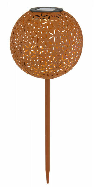 Solar leszúrható fém gömb, rozsdabarna színű, dekor bemarásokkal, közepében üveg golyóval, kapcsolóval, tartalmazza: 1xAA Ni-Mh 300mAh, tartalmazza: 1xLED 0,06W 3V. Az ár 1 darab termékre vonatkozik!