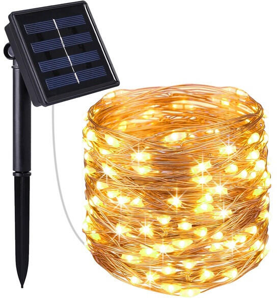 TOO GD-SL001W-100LED szolár LED dekorációs fényfüzér Termék jellemzők: Anyag: PVC, réz, ABS műanyag LED füzér hossza: 10 - 12 m Súly: 150 g Napelem: 2V/100mA (monokristályos szilikon) Ni-MH elem: 1.2V/600mAh AA Fényforrás: 100 x LED melegfehér színben Kapcsoló gomb: Igen Töltési idő: 8 óra Világítási idő: Akár 10 óra (teljes töltöttség mellett) Extra: Villanó fény