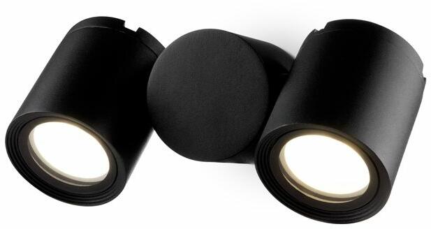 Fekete színű alumínium kültéri fali lámpa billenthető fejekkel, 2db GU10-es foglalattal, IP54-es védelemmel. A lámpát fényforrás nélkül szállítjuk.