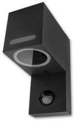 MasterLED Lida mozgásérzékelős szögletes kültéri oldalfali lámpa, GU10-es foglalattal, anyaga alumínium és üveg. Vízvédettsége IP44, alkalmas kültéri használatra. Láthatósági szög 120 ° Mozgásérzékelő Igen Forma Szögletes Felhasználási terület Fali Milyen foglalatú izzóhoz? GU10 Feszültség 220-240 V. Vízállósági szint IP44 Hosszúság 150 mm. Szélesség 68 mm
