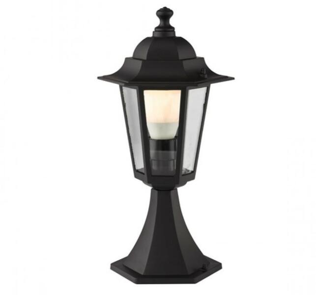 Klasszikus stílusú, kültéri álló lámpa, fekete színű alumínium vázzal, átlátszó üveg búrával, IP33-as védelemmel.