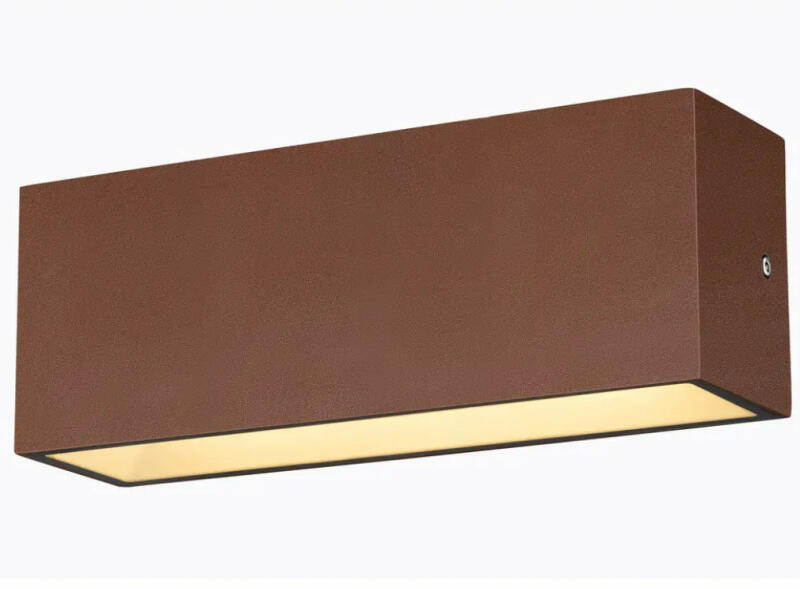 SITRA M WL UP-DOWN LED rozsda IP44 24W 3000/4000K kültéri fali lámpa angol nyelvű gyátrói leírása: The SLV SITRA classic, contemporary light family brings a variety of light to any outdoor area. The rust coloured SITRA CUBE L UP/DOWN wall light fits in perfectly with any architectural style. The indirect lighting atmosphere adds interest to any façade. And thanks to its robust aluminium d