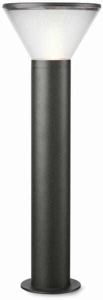 Modern stílusú, kültéri álló lámpa, sötét szürkére festett alumínium szerkezettel, szaténos polikarbonát betétes búrával, IP44-es védelemmel.
