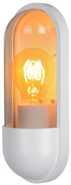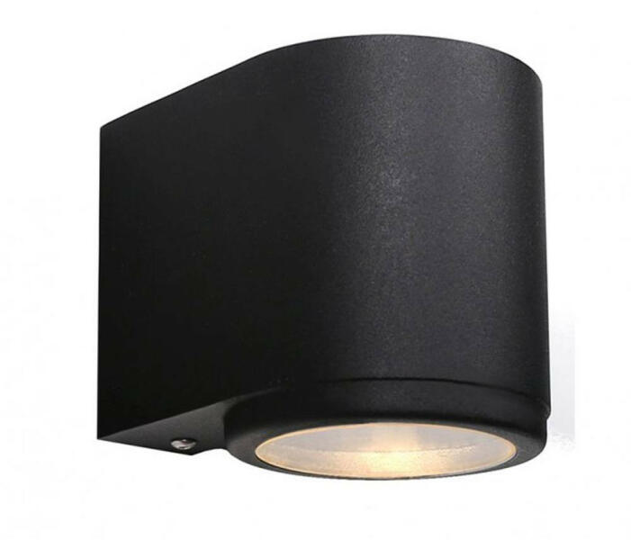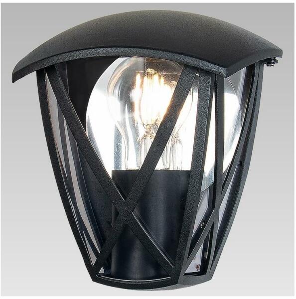 Fekete színű alumínium vázas kültéri fali lámpa átlátszó színű műanyag búrával, E27-es foglalattal, IP44-es védelemmel.