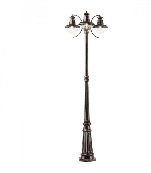 Kültéri álló lámpa antik réz színű alumínium vázzal és átlátszó üveg búrával, IP 44-es védelemmel.