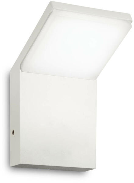 Fehér színre festett alumínium kültéri fali lámpa opálos műanyag betétes búrával, beépített hideg fehér fényű LED fényforrással, IP54-es védelemmel.
