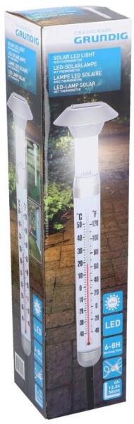 Modern napelemes megvilágító elegáns és ízléses kivitelbenA lámpa hőmérőt tartalmazFöldbe szúrható vagy falra szerelhetőA kapcsoló a szoláris panel alatt találhatóElem a csomag részeA lámpa 6-8 órát világít