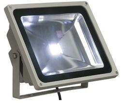 Kültéri reflektor, amely alumíniumból készül és ezüstös szürke színü. IP65-ös védetséggel van ellátva. A lámpa feje állítható. Beépített led izzókat tartalmaz, amelyek hideg fehér színben világítanak. Ez a lámpa erös fényt biztosít viszont emellett enegriatakarékos is. Ideális ipari csarnokok megvilágításához. A lámpa 2 méteres kábellal és a kábel végén