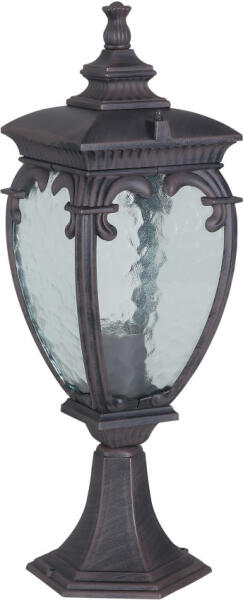 Sötét, antik bronz színű alumínium vázas kültéri álló lámpa átlátszó, hullámos üveg betétes búrával, 1db E27-es foglalattal, IP44-es védelemmel. A lámpát fényforrás nélkül szállítjuk.