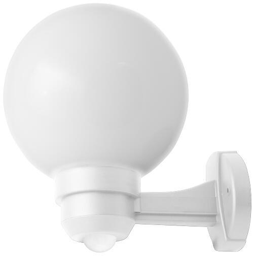 Kerti fali lámpa érzékelővel. Búra tejfehér színű PIR érzékelő reagál a halvány infravörös fényre, amelyet az emberi test kibocsájt. Ha a személy térben mozog, akkor a fény bekapcsolódik. Miután elhagyja az érzékelő teret, akkor a fény automatikusan kikapcsolódik. A szenzor maximális tartománya: 10m. Izzót a csomagolás nem tartalmaz