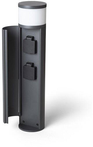 Kültéri állólámpa két foglalattal G9 LED fényforrásokhoz. A foglalatok a lámpa testében vannak elrejtve a nyitható fedél mögött. A foglalatok maximális terhelhetősége 2x2000W.