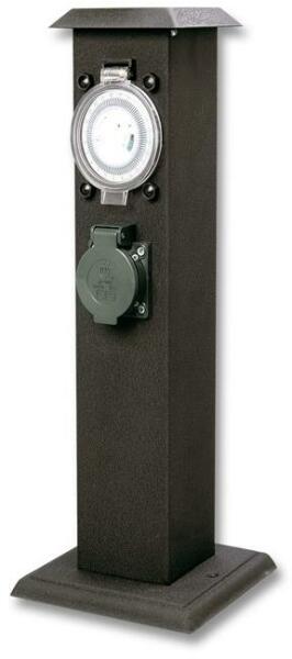 Kerti oszlop 2x csatlakozóaljzat fedéllel, idõzítõvel, IP44 Sötétzöld színű fém elosztó kerti oszlop foglalatos fedéllel alkalmas például kerti felszerelések csatlakoztatására. 2 fiókkal, 24 órás idõzítõvel és szilárd felületekre tervezték. méretek 40 x 16 cm-es foglalatok száma 2 idõzítõ igen (24 óra) szín sötétzöld, fekete anyagú fém, műanyag feszültség