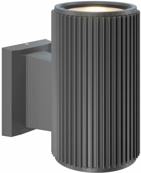 Szürke színű fém kültéri fali lámpa bordázott fém fejjel, 1db E27-es foglalattal, IP54-es védelemmel. A lámpát fényforrás nélkül szállítjuk. A lámpatest ellenáll a rozsdásodásnak és a hőmérséklet ingadozásnak.