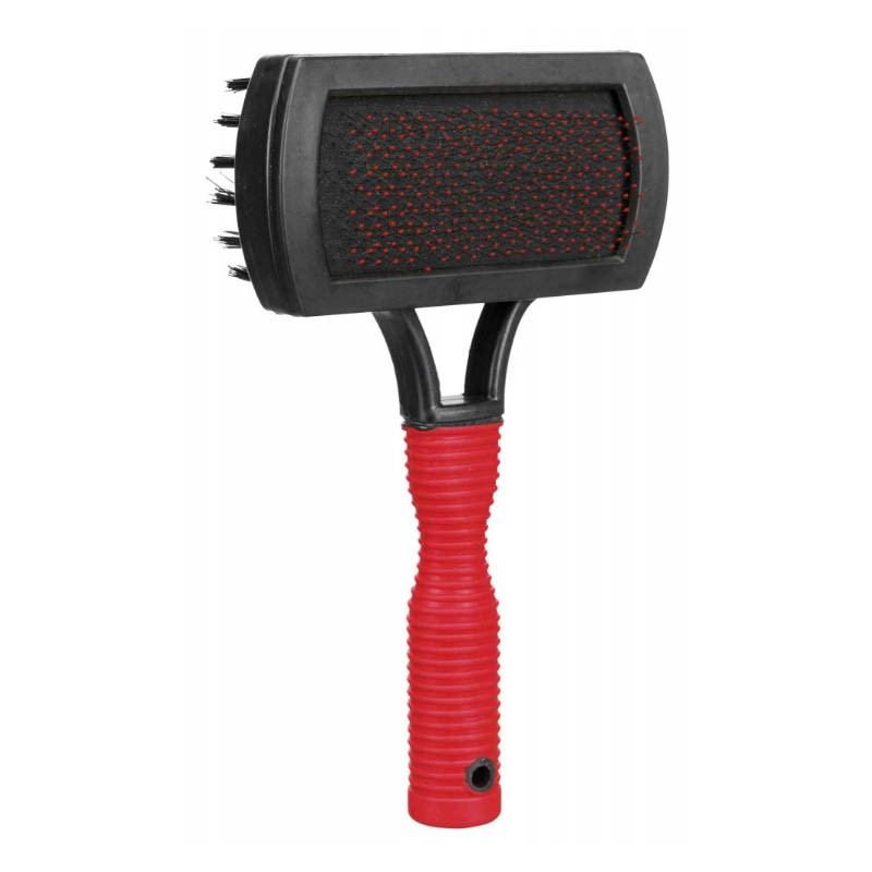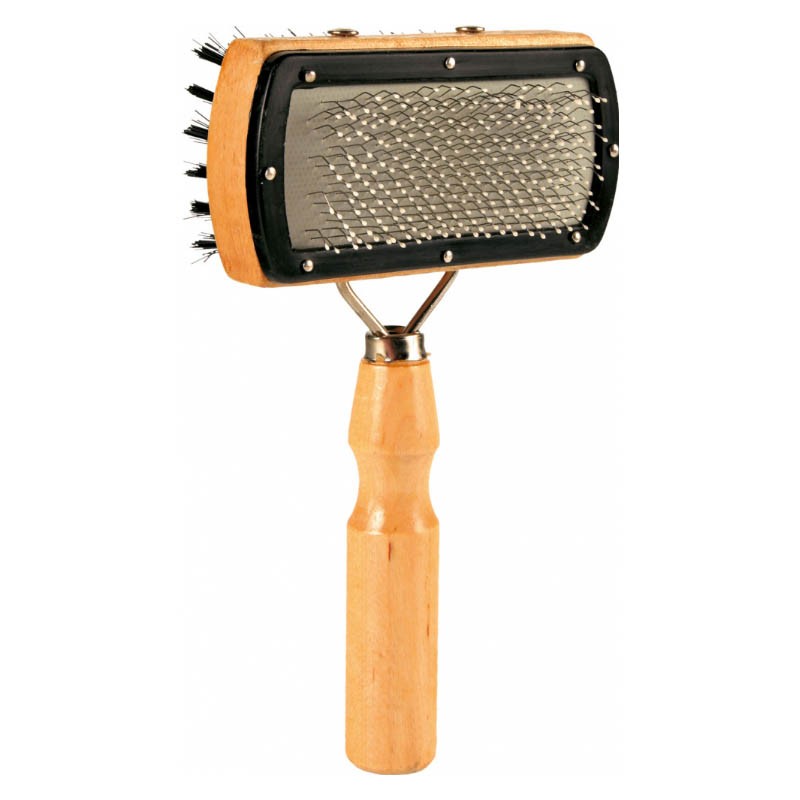 Trixie Kétoldalú fanyelű szőrzetápoló kefe – Szőrápoló fakefe kutyáknak. Egyik oldalán puha fémszálas, a fém szálak végén puha műanyag védelemmel, másik oldalán puha szintetikus sörtékkel. Ajánlott szőrtípusok: Hullámos, göndör szőrzet, rövid szőrzet, hosszú szőrzet, drót-, szálkás- szőrzet Trixie Kétoldalú fanyelű szőrzetápoló kefe ? Szőrápoló fake