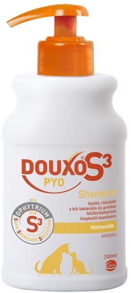 Jellemzők: - A DOUXO® S3 Pyo Sampon egy tisztító sampon kutyák és macskák számára, mely a 3%-os klórhexidin-diglükonátnak köszönhetően a bőr bakteriális és gombás felülfertőzéseinek kiegészítő kezelésére alkalmazható a bőr mikroflóra egyensúlyának felborulása esetén. Tisztító hatása mellett hidratáló hatású és segít fenntartani a bőr mikroflórájának e