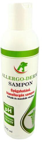 Az Allergo-Derm egy gyógyhatású, hipoallergén sampon kutyák és macskák részére. A termék összetétele (hatóanyagnál mennyiség is) : Pirokton olamin: 0,5 g Sodium Coco-Glucoside Tartarate: 20,0 g Cocamidopropil betain: 13,3 g Sodium lauroyl sarcosinate: 1,0 g Hidrolizált Zabfehérje: 2,0 g Propilén-glikol /Benzil alkohol/Methylchloroisothiazolinone/Meth ylisothiazolinone: 0,125 g Al