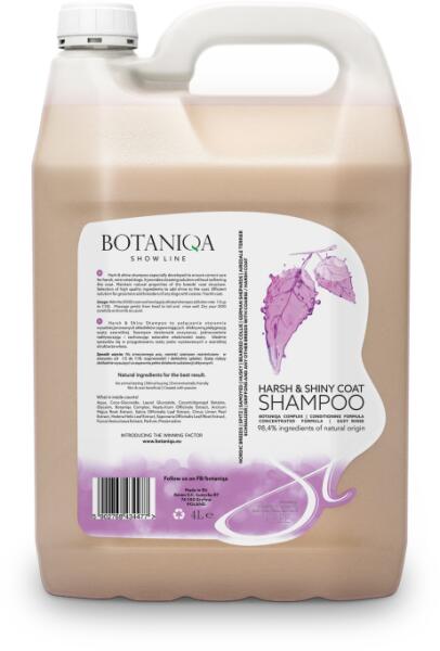 BOTANIQA Harsány és fényes szőrzet sampon durva szőrű kutyáknak 4l - Termékleírás A Harsh & Shiny sampon gondosan válogatott összetevők kombinációja a hatékony durva szőrzetápoláshoz. A sampon tökéletesen tisztít, miközben megőrzi a szőrzet természetes tulajdonságait. A szőrzet durva és fényes marad. 98,4%-ban természetes eredetű összetevők. Olyan kutyák, ame