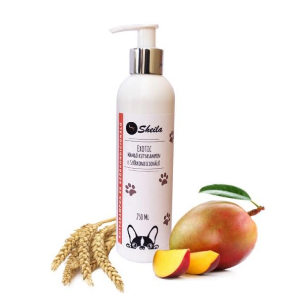 A Sheila Exotic Mangó Kutyasampon kézzel készült, magyar termék, amely kímélő, bőrbarát összetevőkből áll. Kőolajszármazékot nem tartalmaz illetve pálmaolaj felhasználása nélkül készült. Alkotóelemek Az Exotic Mangó kutyasampon és szőrkondicionáló rendszeres használata kiválóan alkalmas négylábú kis barátaink szőrének rendszeres tisztítására. Az olívaolaj