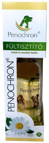 A Penochron egy fülmosó oldat, ami kutyák és macskák részére egyaránt alkalmas. Összetétel : Víz, Nátrium-lauril-szarkozinát, Kamilla kivonat, Bórsav, ESTER 610, Kamilla illat A termék felhasználási területének rövid leírása, felhasználási javaslat, javallatok :A termék alkalmas kutyák és macskák zsíros, szennyezett fülkagylójának és külső hallójáratának rends