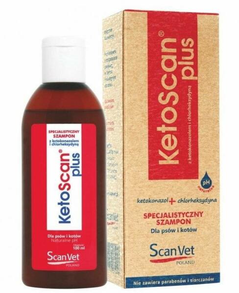 Scanvet Ketoscan Plus 100ml - Termékleírás A KetoScan PLUS sampon a korpásodásra, bőrbetegségekre és gombás és bakteriális eredetű gyulladásokra hajlamos kutyák és macskák bőrének ápolására szolgál. Scanvet Ketoscan Plus 100ml - Műszaki adatok Összetétel: Aqua, Lauramidopropil-bétain, Laurilglükozid, Klórhexidin-diglukonát, Oleamid DEA, Ketokonazol, PEG-75 Lanolin, PEG