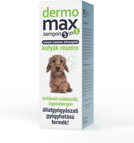 300ml A Dermomax sampon 3 in 1 egy hipoallergén, bőrnyugtató hatású sampon és balzsam. Egészséges állatok esetén a termék alkalmas a bőr, a szőrzet alapos tisztítására, a szőrtakaró kondicionálására. Olyan növényi anyagokat (kamilla-, körömvirág-, cickafarkfű-, csalánlevél-kivonatokat, citrom-, levendula-, ligetszépe-, teafa olajokat) és mentolt tartalmaz, amely az i