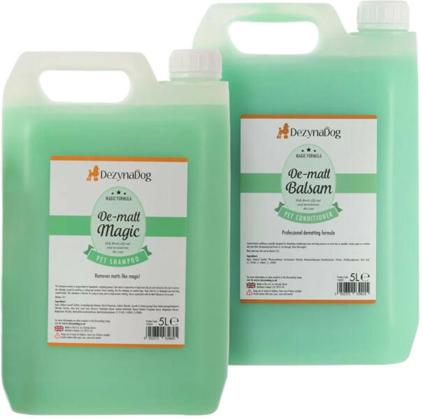 DezynaDog De-Matt Magic Sampon 5 liter Fáradt attól, hogy folyamatosan makacs csomókkal és összegabalyodott szőrzettel küzdjön? A De-Matt Magic az Ön számára megfelelő sampon! Ez a sampon nemcsak eltávolítja a gubancokat és kibontja a szőrzetet, hanem megelőzi a károsodást és csökkenti a jövőbeli gubancolódás esélyét. Egyesült Királyságban gyártva Kiváló minőség