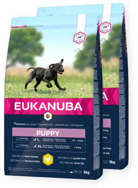 Eukanuba Puppy Large Az olyan nagy méretű kutyák kölykei, mint pl. a labrador, németjuhász, golden retriever vagy rottweiler sokkal gyorsabban nőnek, mint kisebb fajtársaik. Így azután fitt és egészséges növekedésükhöz speciálisan szükségleteikhez szabott eledelre van szükségük. A 20% friss csirkét is magában foglaló szárnyashúsban gazdag száraztáp különösen ízlet