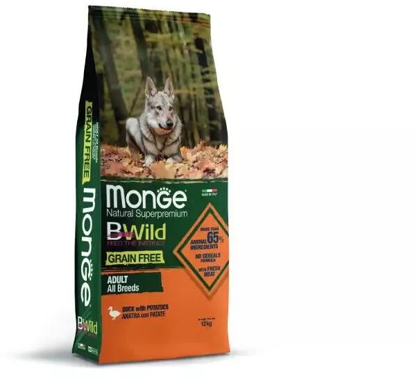 Monge BWild Grain Free Dog Adult - Duck, PotatoTeljes értékű és kiegyensúlyozott, gabonamentes szárazeledel felnőtt kutyáknak kacsával és burgonyával. Az olyan válogatott, nem gabonából származó szénhidrátforrásoknak köszönhetően, mint a burgonya és a lencse, támogatja kutyája egészségét. Mangán-oligoszacharidokkal (M. O. S. ) és Xylo-oligoszacharidokkal (XOS), valami