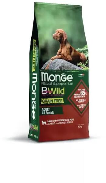 Monge BWild Grain Free Dog Adult - Lamb, Potato, PeasTeljes értékű és kiegyensúlyozott, gabonamentes szárazeledel felnőtt kutyák számára báránnyal, burgonyával és borsóval. Az olyan válogatott, nem gabonából származó szénhidrátforrásoknak köszönhetően, mint a burgonya és a lencse, támogatja kutyája egészségét. Mangán-oligoszacharidokkal (M. O. S. ) és Xylo-oligosz
