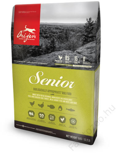 Orijen Senior - szárazeledel kutyáknak tele van tápláló fehérjékkel, melyek létfontosságúak az idős kutya számára, mivel a szervezet kevésbé hatékonyan tud fehérjéket előállítani. Jellemzők: - A 38 %-os tápláló fehérjetartalom és a 19 %-os alacsony szénhidrát felel meg az idős kutya biológiai és evolúciós szükségleteinek. - Eltérően más száraztápoktól, az