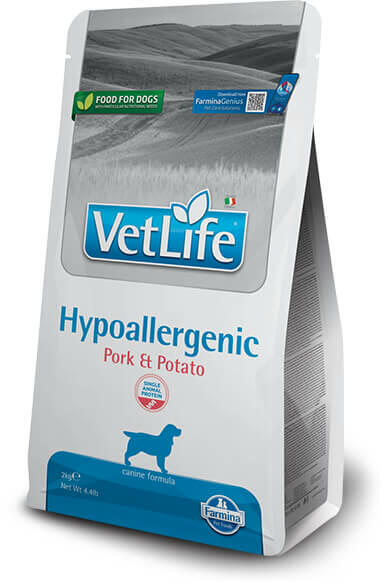 Vet Life Natural Diet Dog Hypoallergenic Pork&Potato egy teljes értékű diétás eledel felnőtt kutyák számára. Olyan kutyusoknak készült, akik valamely összetevővel vagy tápanyaggal szembeni érzékenységgel küzdenek. A gondosan válogatott összetevők megfelelő kombinációja segít csökkenteni az érzékenység tüneteit és erősítheti a bőr védelmi funkcióját olyan es