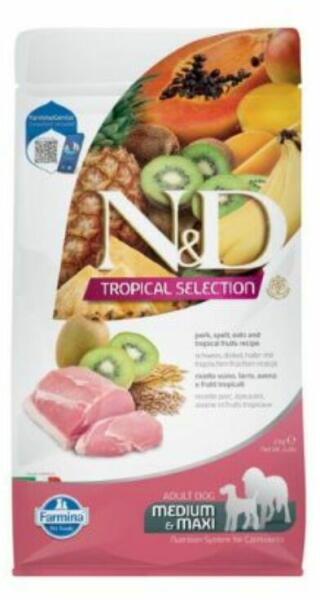A N&D Tropical Selection Dog Pork Adult Medium&Maxi egy ínycsiklandó szárazeledel trópusi gyümölcsökkel és sertéssel. Kifejezetten közepes és nagy testméretű felnőtt kutyusok számára kifejlesztett táp. Csirkehúsmentes recept. Különleges sertéshúsos száraztáp trópusi gyümölcsökkel és ősi gabonafélékkel. - A sertéshús B- és A vitaminban dús. Ásványi anya
