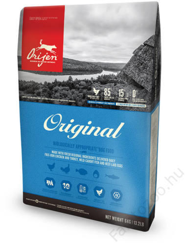 Gabonamentes, fehérjékben és tápanyagokban gazdag prémium-eledel bármely fajtájú felnőtt kutyának friss kanadai alapanyagokból; 85% hal-, tojás és húsrészaránnyal, 15% zöldség- és gyümölcstartalommal. Az Orijen Original szárazeledel receptúrája a WHOLEPREY-elvet követi, amely kutyusa természetes tápanyagszükségletét veszi alapul. A kutya vadon élő őseinek étlapjá